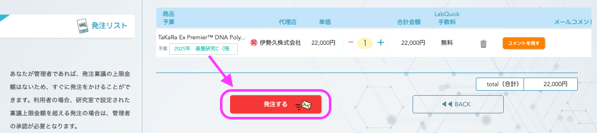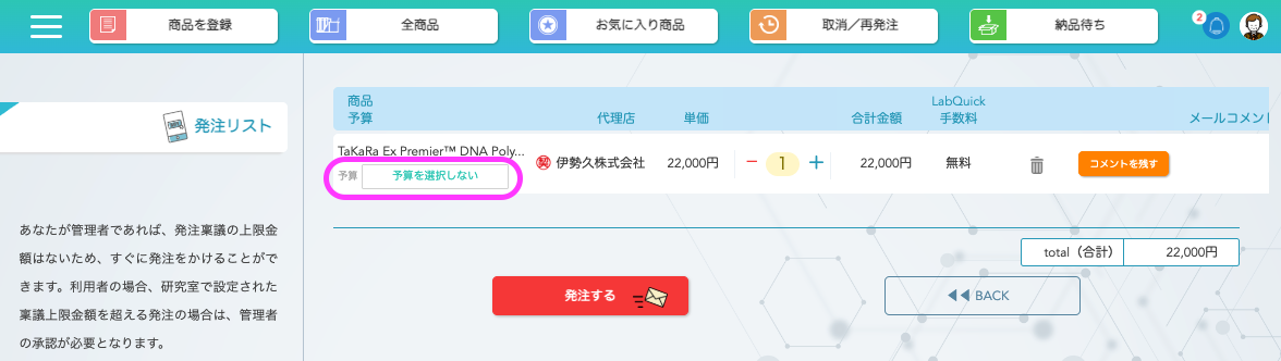 予算項目を選択後、「発注する」をクリックして、注文完了です。