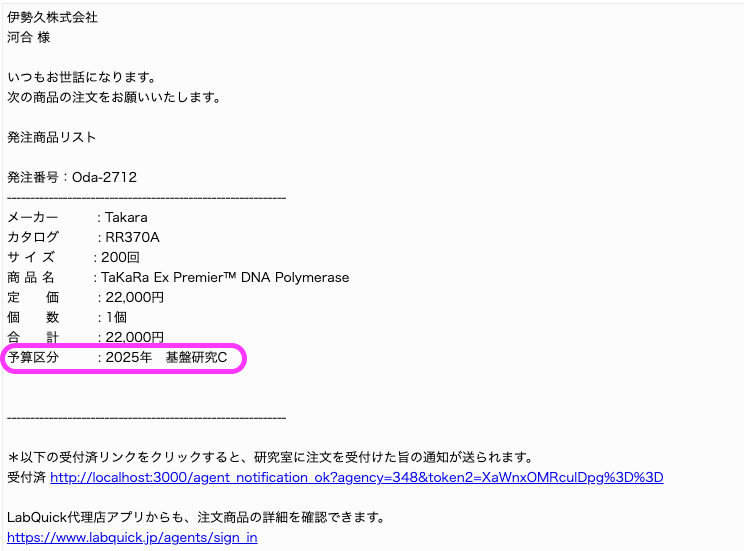 控えメール、代理店担当者様へのメールに「予算区分」として、記載されます。