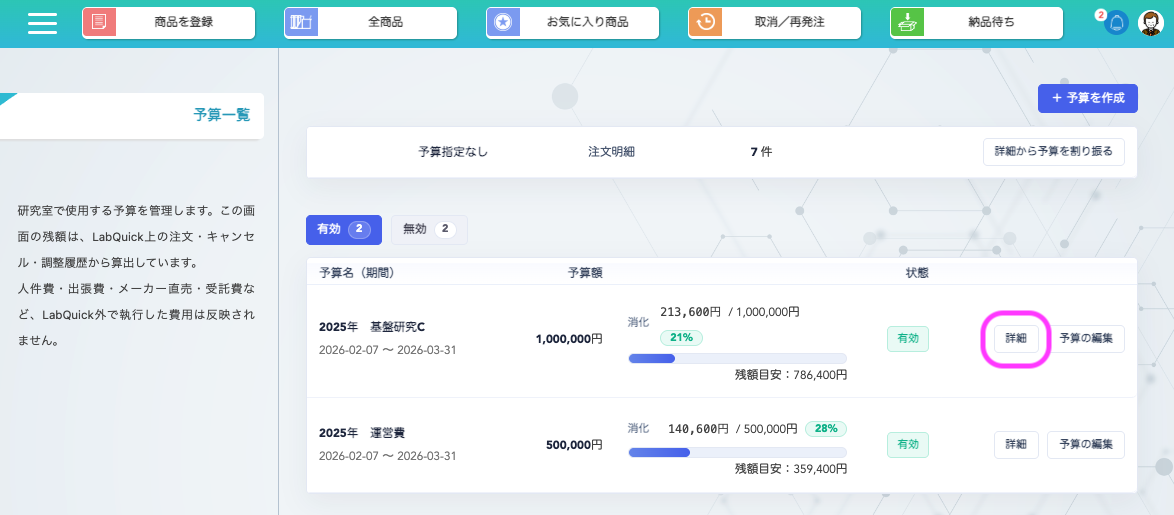 商品を注文後、予算区分を変更したいときは、予算一覧から、それぞれの項目の「詳細」をクリックしてください。