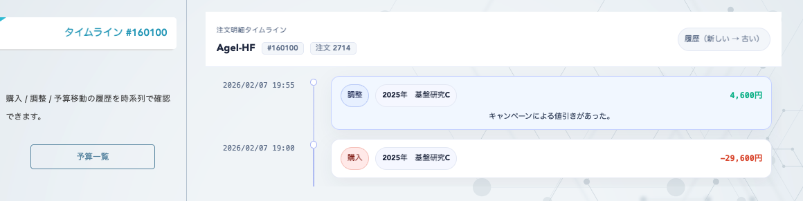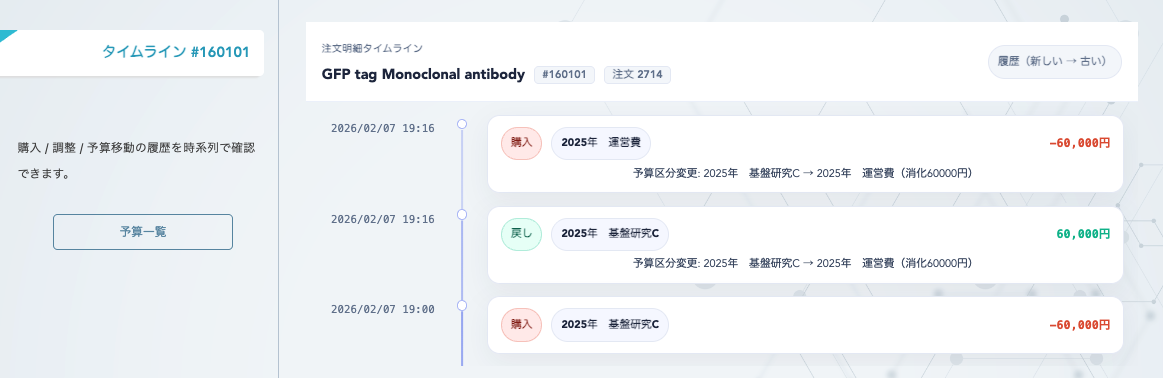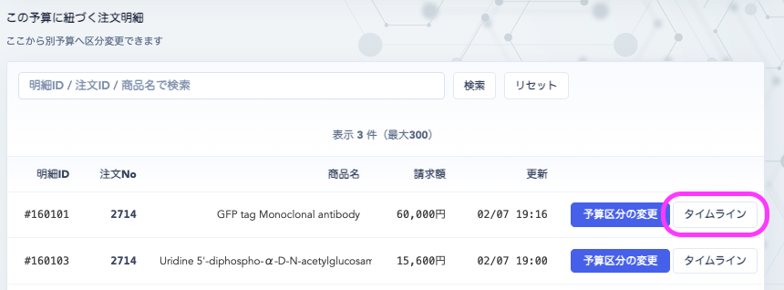 商品の予算区分の変更履歴を「タイムライン」として、確認することも可能です。