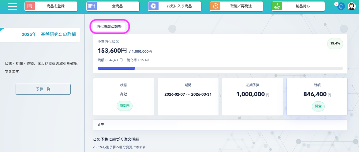 予算状況・残額(目安)の確認は、予算管理から行なっていただけます。