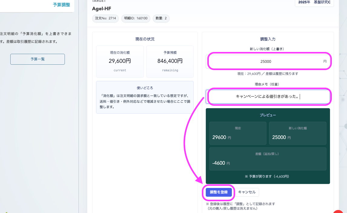 予算調整画面の右側、調整入力で、新しい金額を入力、必要に応じて、理由などのメモ(任意)を記載ください。