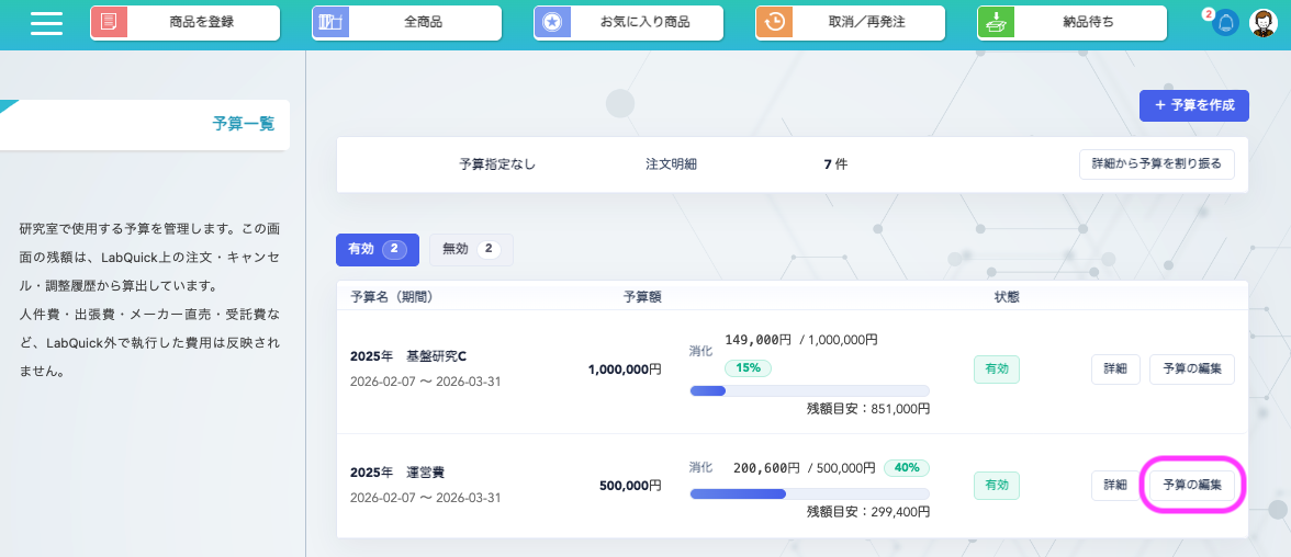 予算一覧から、無効化したい予算区分の「予算の編集」を選択してください。