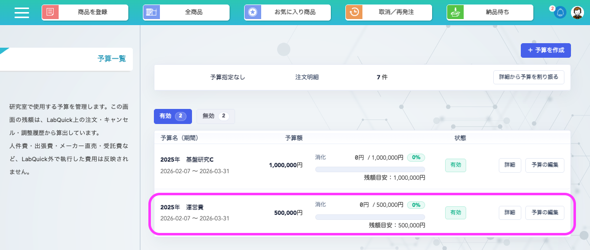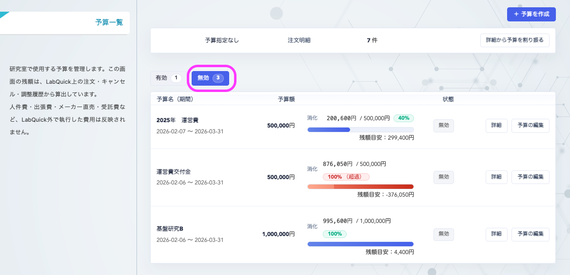 期限が過ぎた予算区分や残額の無くなった予算区分は無効化することで、注文時の予算選択で、表示されなくなります。