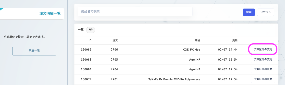 注文商品のリストが出ますので、変更したい商品の「予算区分の変更」をクリックします。