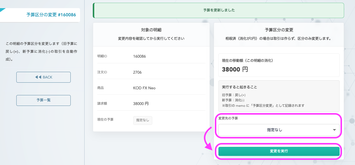 「詳細」をクリックしていただくと、さらに詳しい内容が確認でき、予算区分の変更を行うことも可能です。