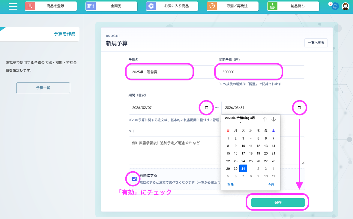 「予算を作成」画面に移動します。こちらで予算名や初期予算、期間などを入力します。