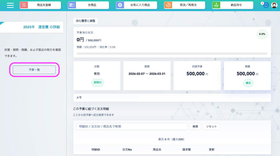 予算一覧から、現在有効な予算の執行状況を確認いただけます。