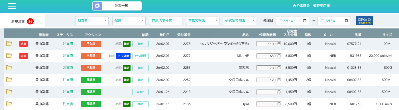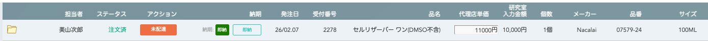 商品が納品された場合、研究室側、代理店様側、双方から「未配達」から「配達済」としていただくことが可能です。