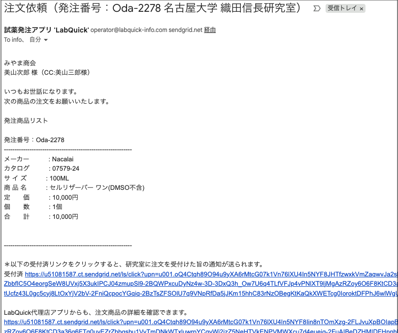 メール文の下部にあります、「受付済」のリンクをクリックすると研究室側に、代理店担当者が注文を確認したことをお知らせできます。
