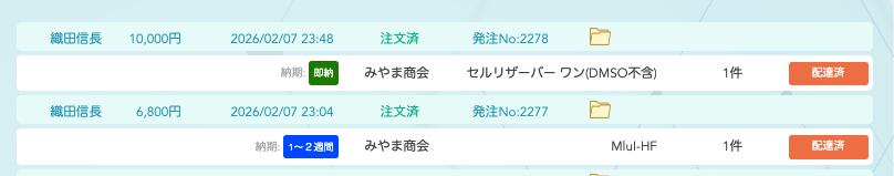 「代理店受付済」と表示されることで、研究室も注文が受け付けられたことがわかり、安心できます。