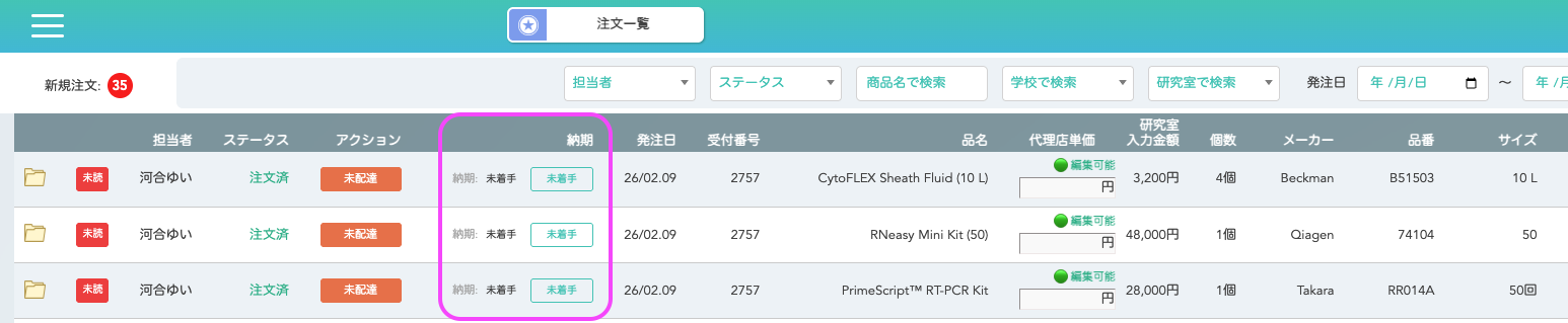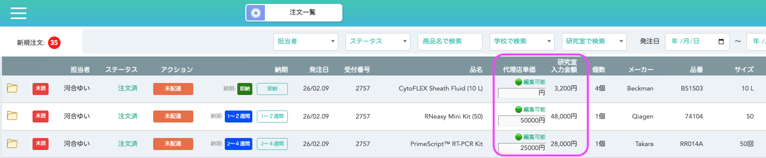 最初、注文一覧の画面には、研究室が注文の際に入力した金額が表示されています。