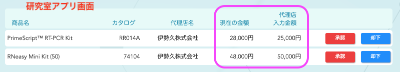 注文一覧ページの項でも記載しましたが、アプリを用いて、研究室ユーザーに納期や売価の情報を共有することができます。売価については手数料とも関係しますので、もし研究室が入力した商品の金額を訂正する必要がありましたら、記載ください。