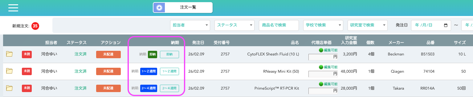 こちらは、発注を行った研究室アプリにも納期予定として反映されます。
